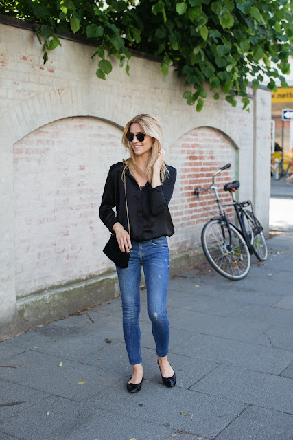 Este es un look básico y que te puedes poner cuando no quieras pensar mucho en tu look del día. Nunca quedarás mal con el color negro, es una regla de la moda. Pero también hay que aprender de no abusar ya que tendemos a caer en comprar solo prendas negras y al final nuestro guardaropa parecerá el de Morticia Addams. Este es un buen uso del color negro, combinar tus flats o chinitas negras con la blusa y unos jeans.